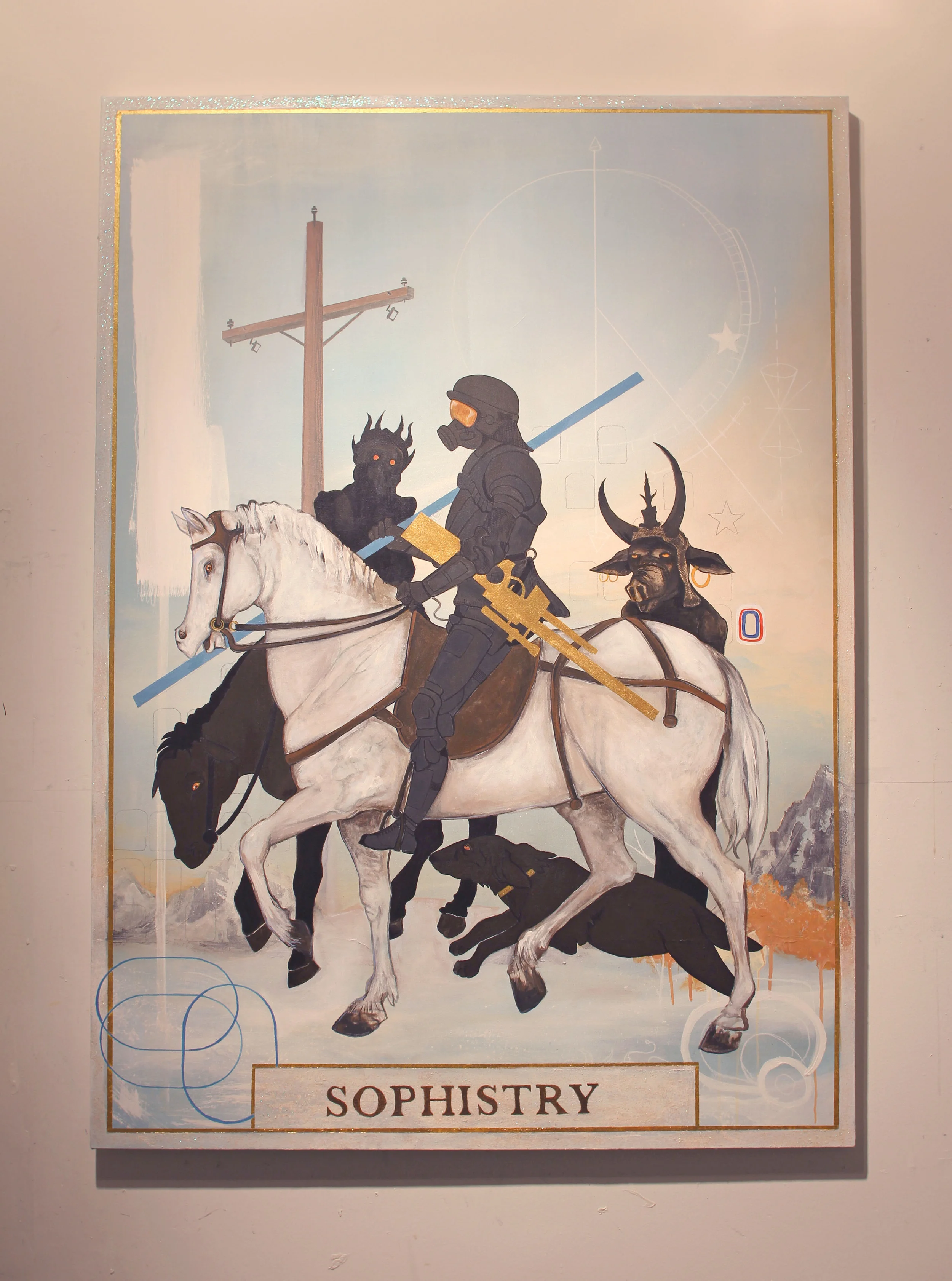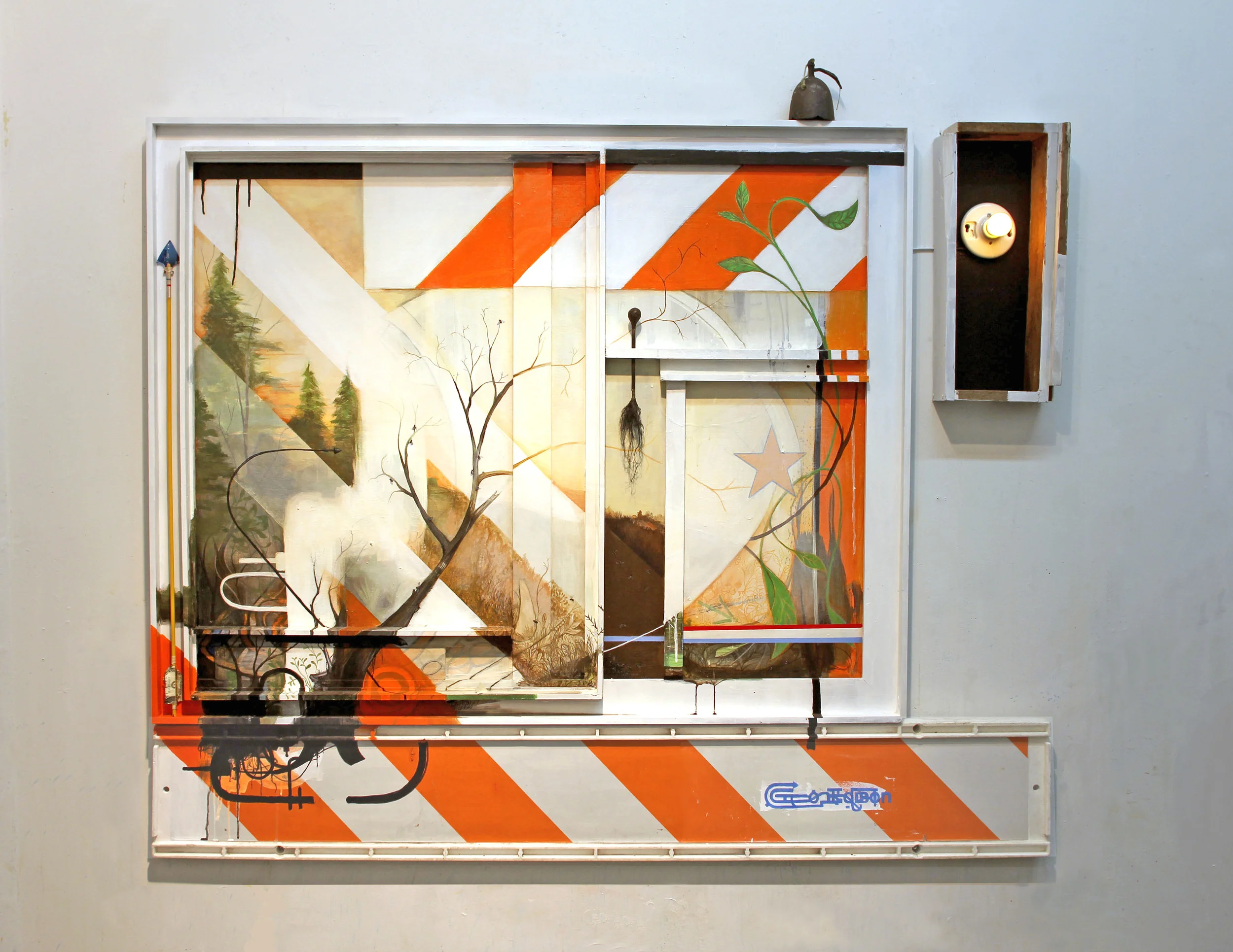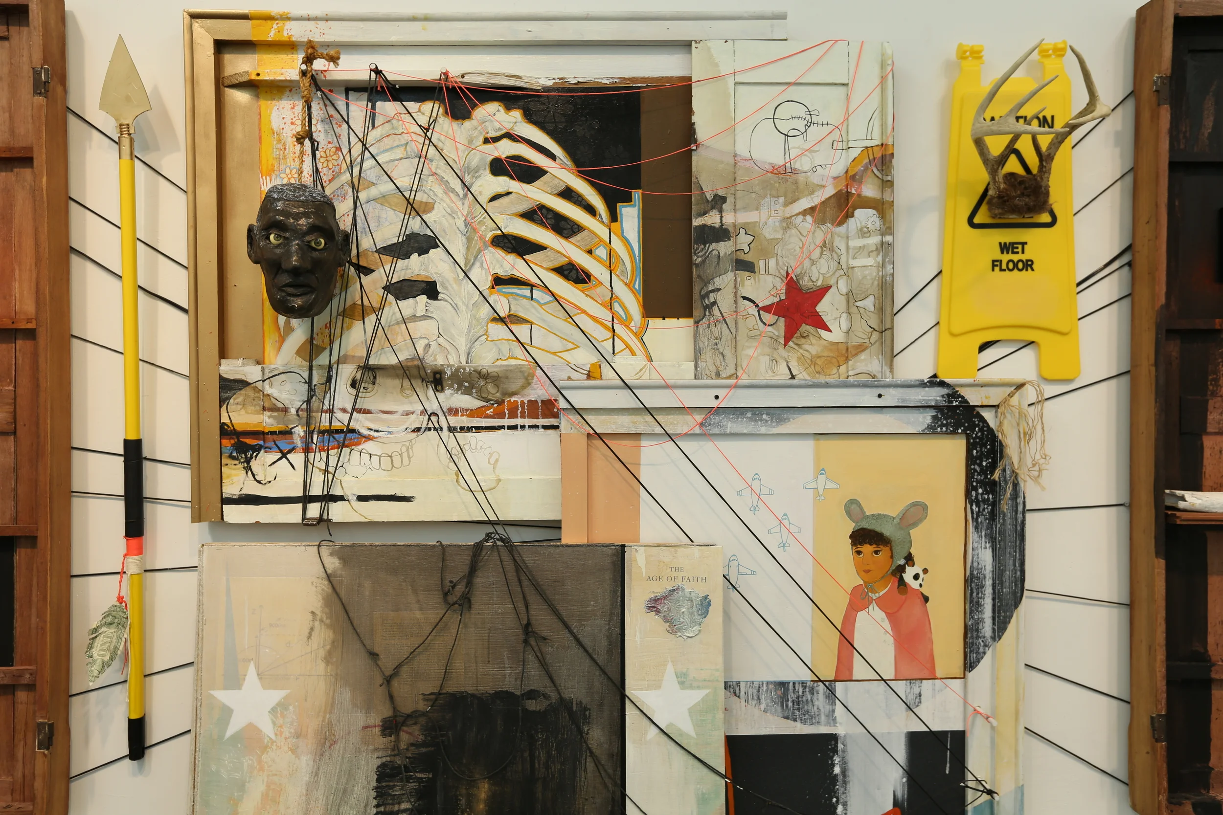 Mixed medium, oil, acrylic, nylon chord, cattle bone, deer antler, plastic wet floor, paper mache', lights and lighting fixtures, grip tape, ball, mop handle,Wood assemblage,
