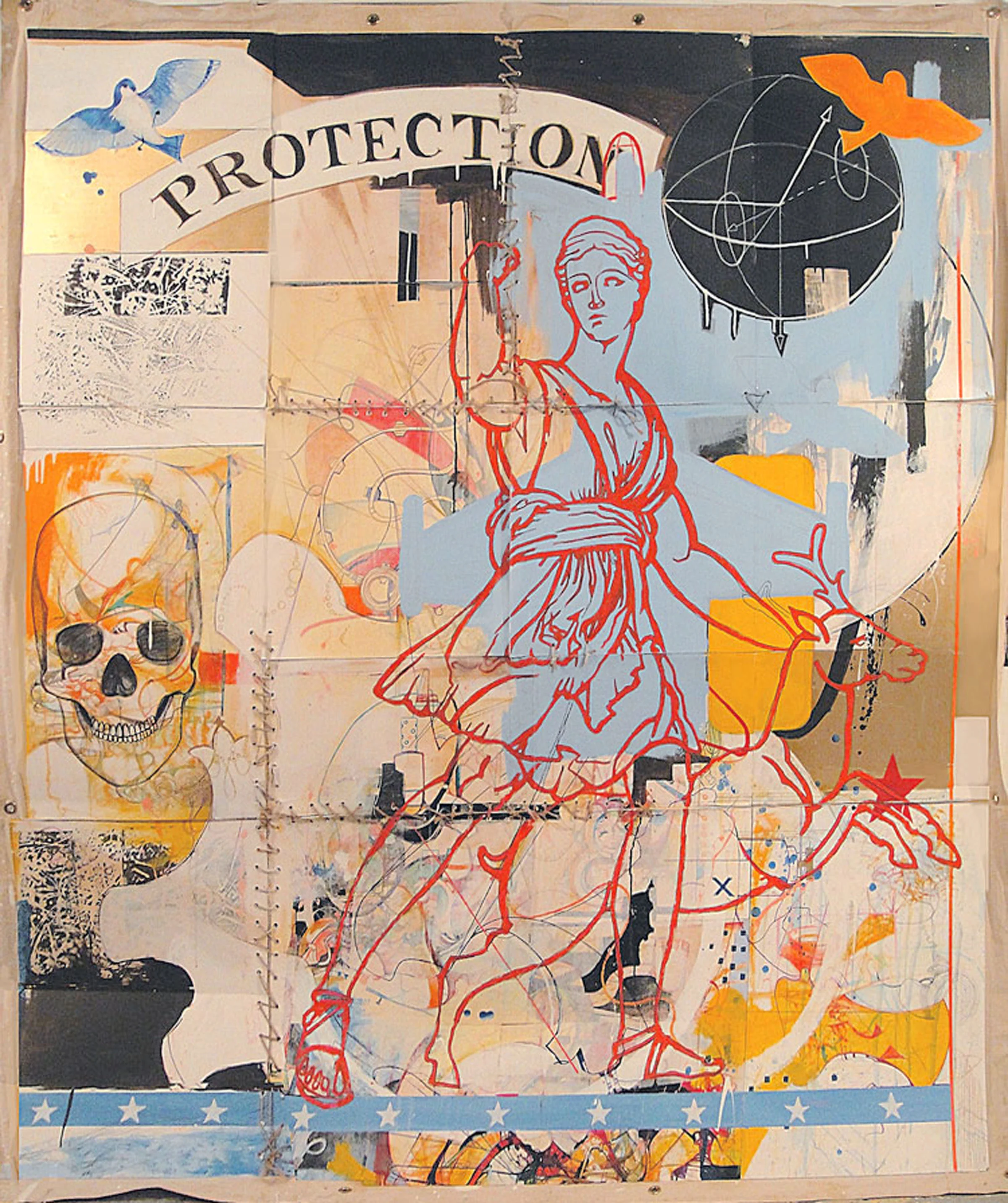 Synthetic polymer, conte", graphite, ink, sewn twine, brass, grommets, archival museum board, acid free metallic matt, mounted on canvas. 85.5" x 96"