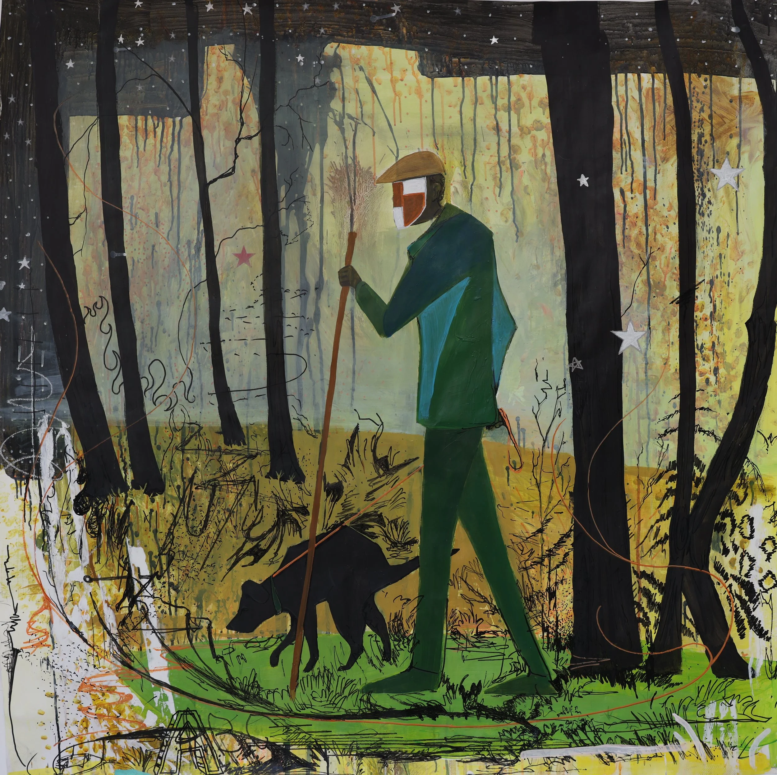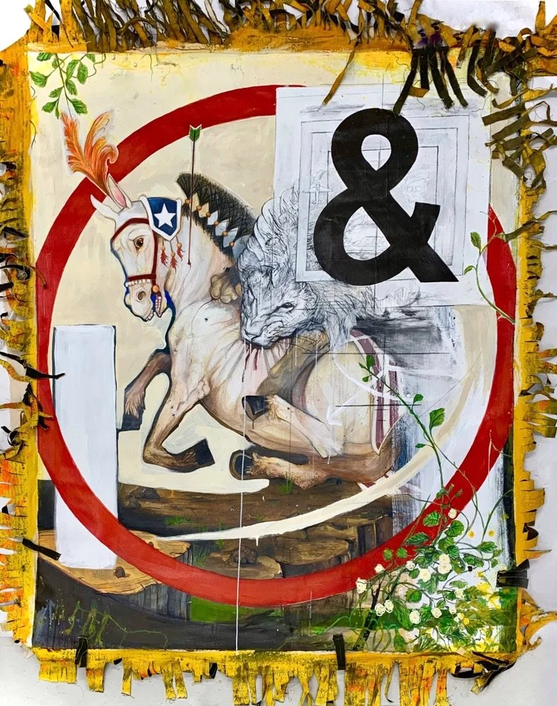Mixed medium, oil, acrylic, nylon chord, cattle bone, deer antler, plastic wet floor, paper mache', lights and lighting fixtures, grip tape, ball, mop handle, Wood assemblage,