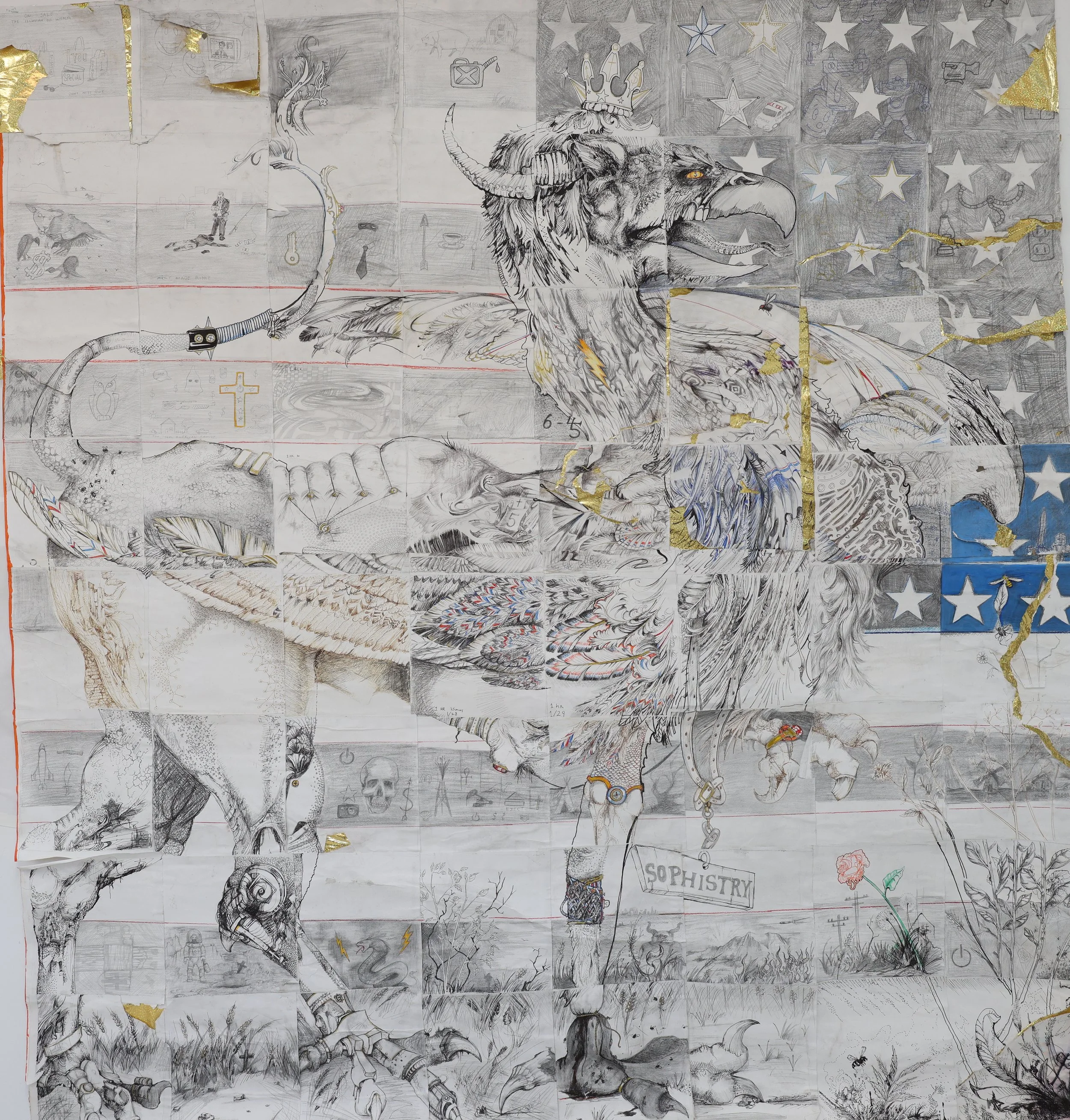 Ink, collage, graphite, conte', collage, synthetic polymer, archival cotton paper.